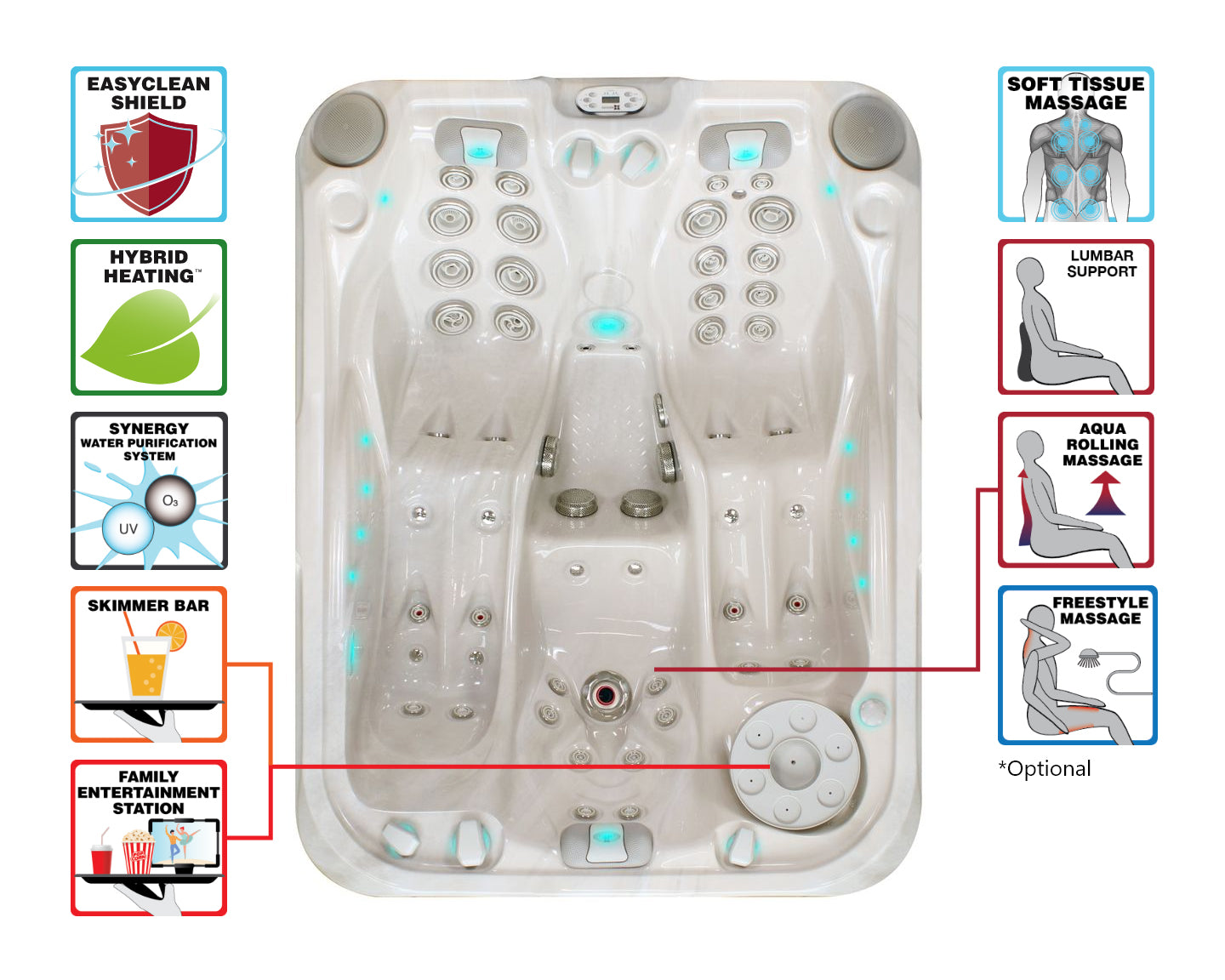 - Gerichte hydrotherapie: krachtige, nauwkeurig geplaatste jets voor rug, schouders en benen.