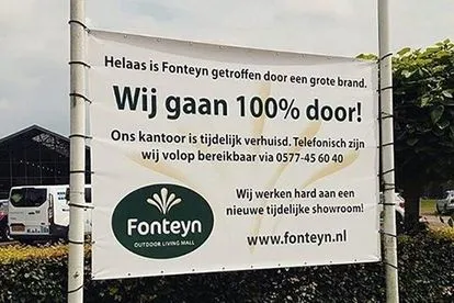 Een grote klap voor de grootste Outdoor Living Mall van Europa. Maar zeker niet de nekslag! Dezelfde dag nog wordt een tijdelijk kantoorpand geregeld waar in de avond en nacht keihard wordt gewerkt om 50 werkplekken draaiende te krijgen. En dat lukt! Het Fonteyn team laat ongekende veerkracht zien. Klanten worden geholpen via mail en telefoon en een maand later in een tijdelijke showroomtent voor het verwoeste pand. Alles om zo snel als mogelijk klanten weer te laten genieten van het buitenleven!