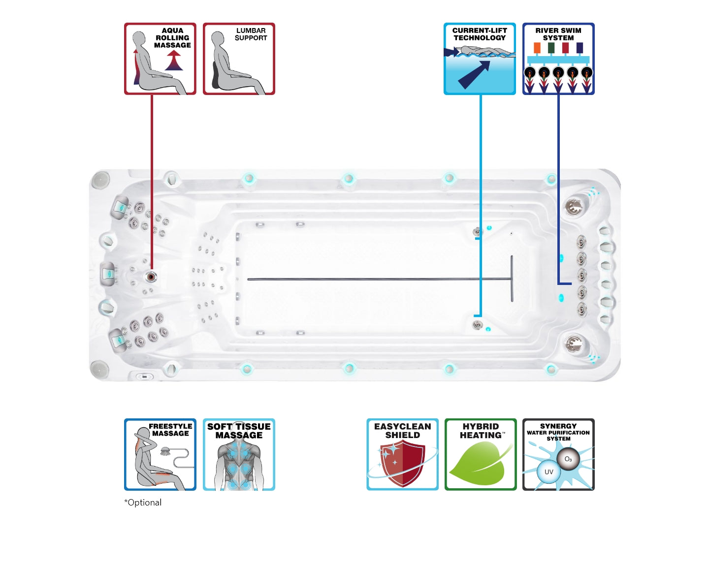 - River Swim System™ + Current-Lift Technology™: gelijkmatige, brede stroming voor natuurlijke slagen; automatisch extra lift onder 50% jet-output voor langere, stabiele borstcrawl.