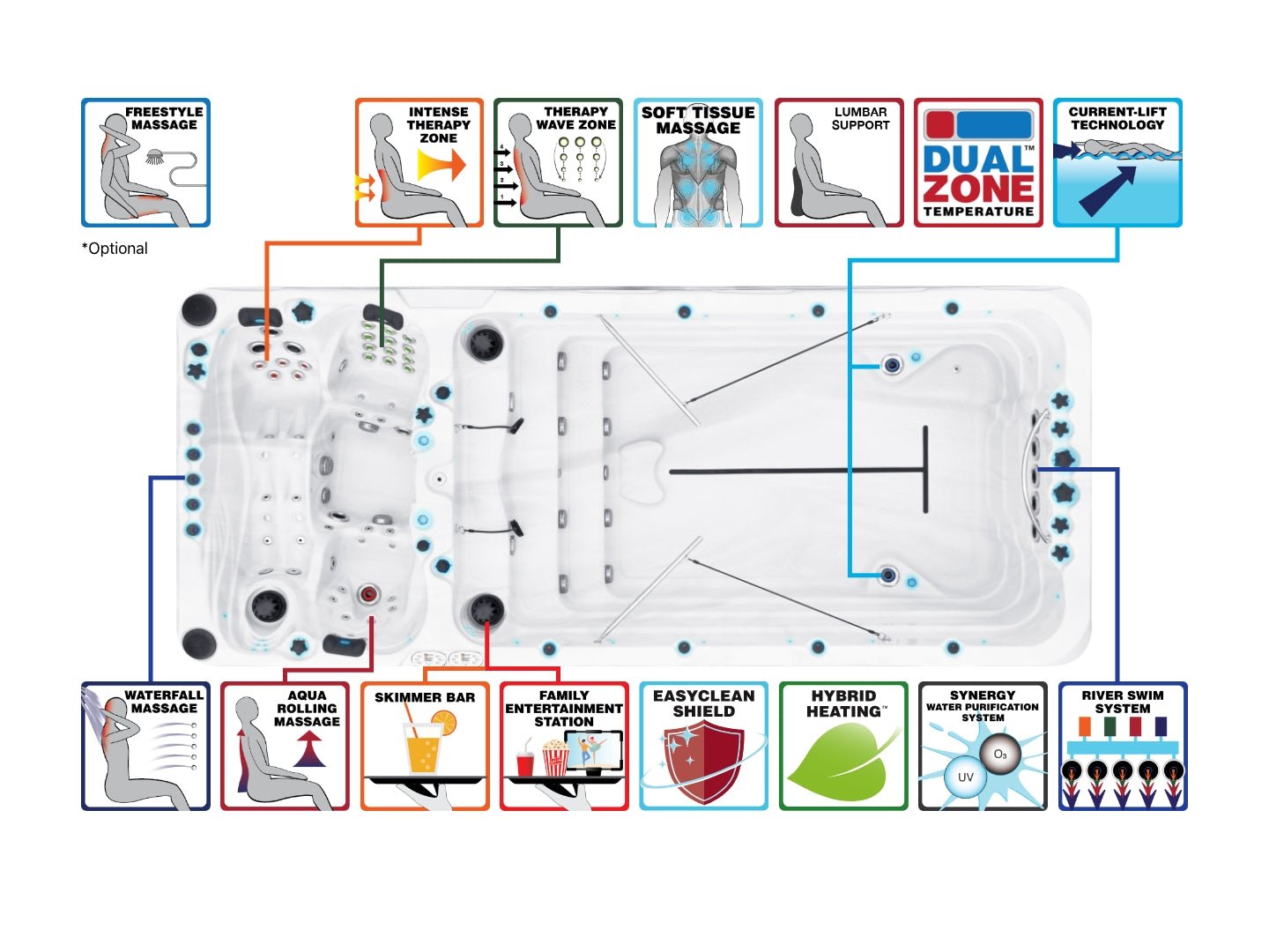 - Dual Zone temperatuurregeling – stel de zwemzone koeler in en de spa-zone warmer; perfect voor een sportieve sessie gevolgd door diepe ontspanning.