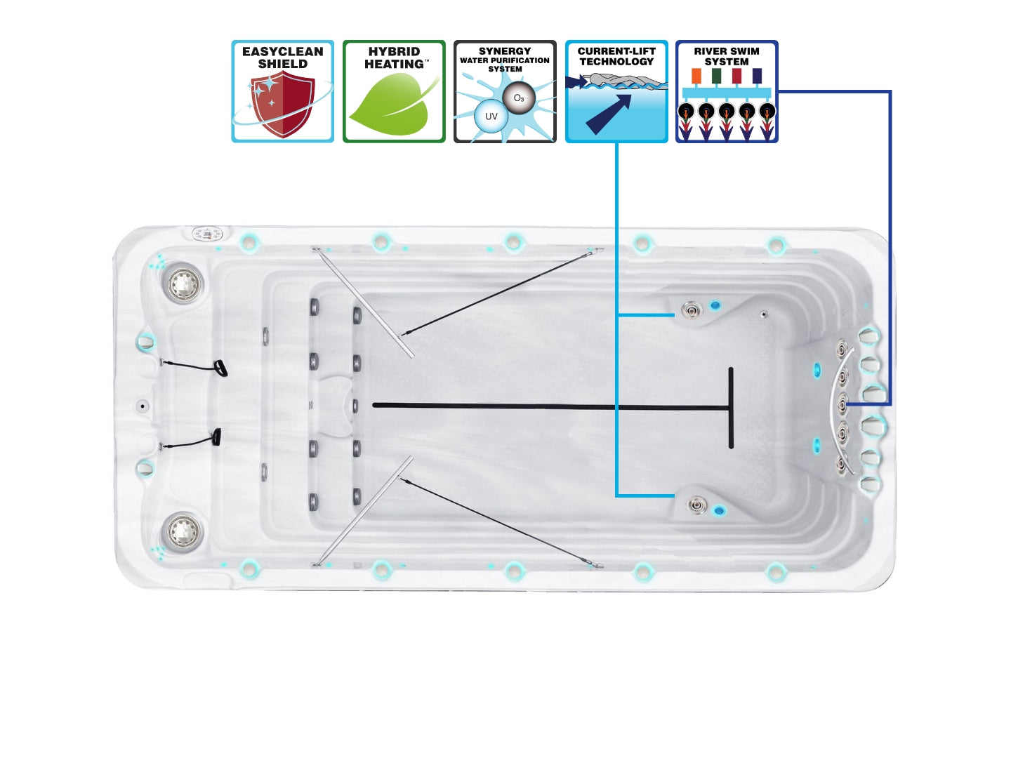 De Zwemspa Fitness 2 is een slim alternatief voor een traditionele pool with spa. Dankzij de krachtige zwemjets en de innovatieve Current Lift Technology blijf je stabiel in het water, zelfs tijdens intensieve trainingen. Zo geniet je van een natuurlijke zwemervaring zonder dat je veel ruimte of onderhoud nodig hebt.